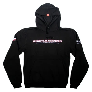 Radflo Shocks Motorsport Hoodie Black to wygodna, wysokiej jakości bluza z kapturem stworzona z myślą o miłośnikach marki Radflo i sportów motorowych. Wykonana z miękkiej, ciepłej mieszanki bawełny i poliestru, zapewnia komfort noszenia zarówno na co dzień, jak i podczas eventów off-roadowych czy wyścigowych.