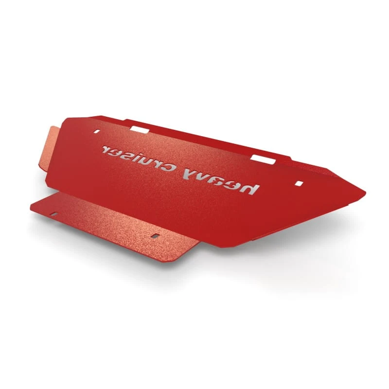 Czerwona osłona chłodnic i przekładni kierowniczej do VW Amarok V6 (2023–) to pierwszy i najważniejszy element kompletu osłon podwozia HC, zaprojektowany specjalnie do jazdy w ciężkim terenie. Osłania kluczowe podzespoły pojazdu z przedniej części: chłodnice, osprzęt silnika oraz przekładnię kierowniczą – elementy, które w warunkach off-roadowych są najbardziej narażone na uszkodzenia wskutek uderzeń kamieniami, gałęziami czy przeszkodami terenowymi.