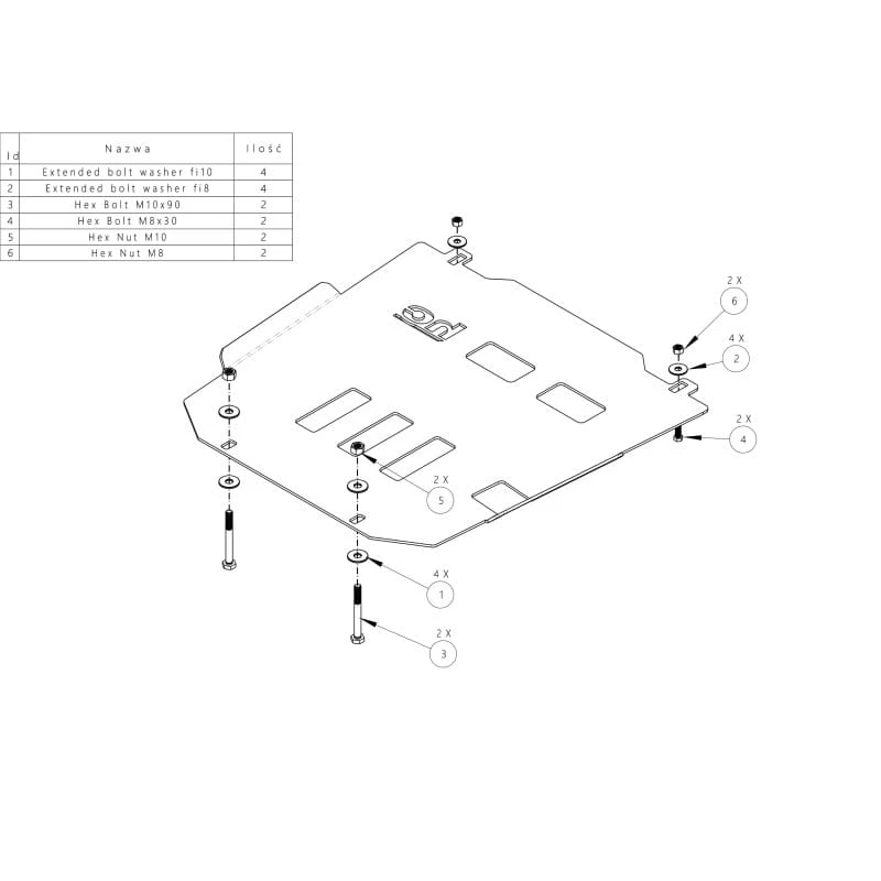 Produkt montowany jest w fabryczne otwory w ramie pojazdu oraz do przedniej osłony HC. Zawarte w konstrukcji otwory wentylacyjne ułatwiają chłodzenie oraz odprowadzanie błota. Osłona stanowi integralny element systemu HC i łączy się z pozostałymi płytami, tworząc pełną i sztywną ochronę podwozia.