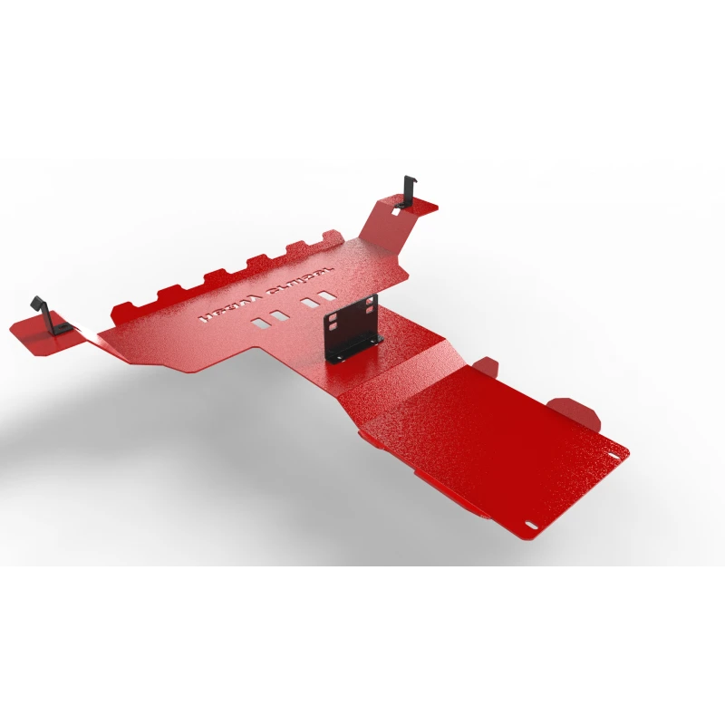 Osłona montowana jest w czterech punktach ramy pojazdu, a jej przednia część łączy się bezpośrednio z osłoną silnika Heavy Cruiser. Oba elementy tworzą spójny, bardzo sztywny zestaw ochronny zabezpieczający cały układ napędowy od przodu aż po centralną część pojazdu. Dzięki dwuwarstwowej czerwonej powłoce proszkowej osłona jest odporna na korozję, a zarazem nadaje pojazdowi charakterystyczny terenowy wygląd.
