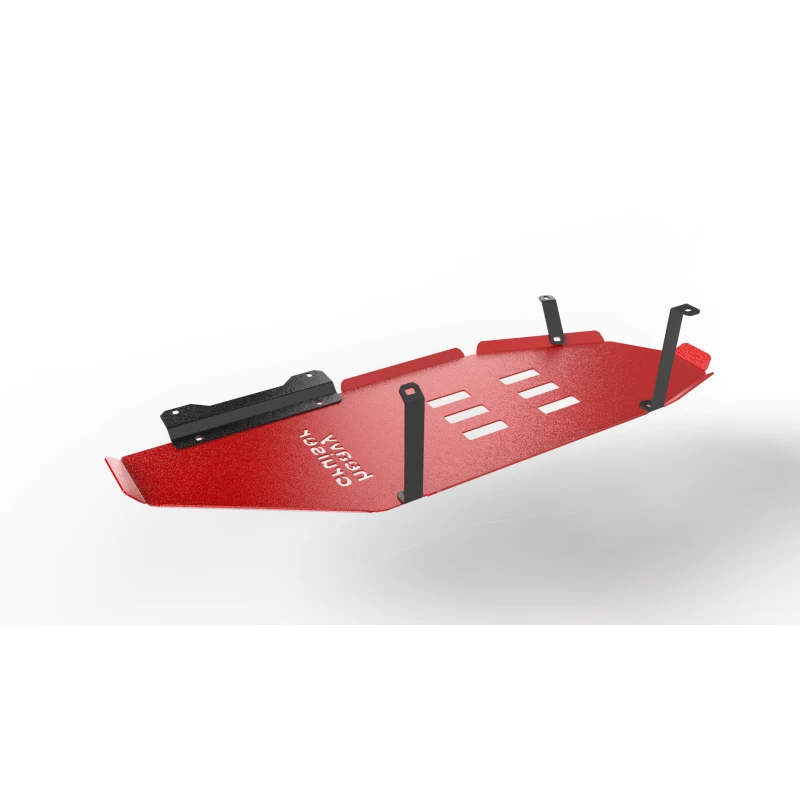 Montaż odbywa się w czterech punktach ramy pojazdu, z wykorzystaniem fabrycznych otworów – bez konieczności wiercenia czy spawania. Stalowa blacha o grubości 4 mm gwarantuje bardzo wysoką wytrzymałość, a czerwone malowanie proszkowe klasy 5 z podkładem antykorozyjnym oraz lakierem ze strukturą zapewnia długotrwałą ochronę przed korozją. Dodatkowe otwory w konstrukcji umożliwiają swobodne odprowadzanie błota i wody, co ułatwia utrzymanie osłony w czystości.