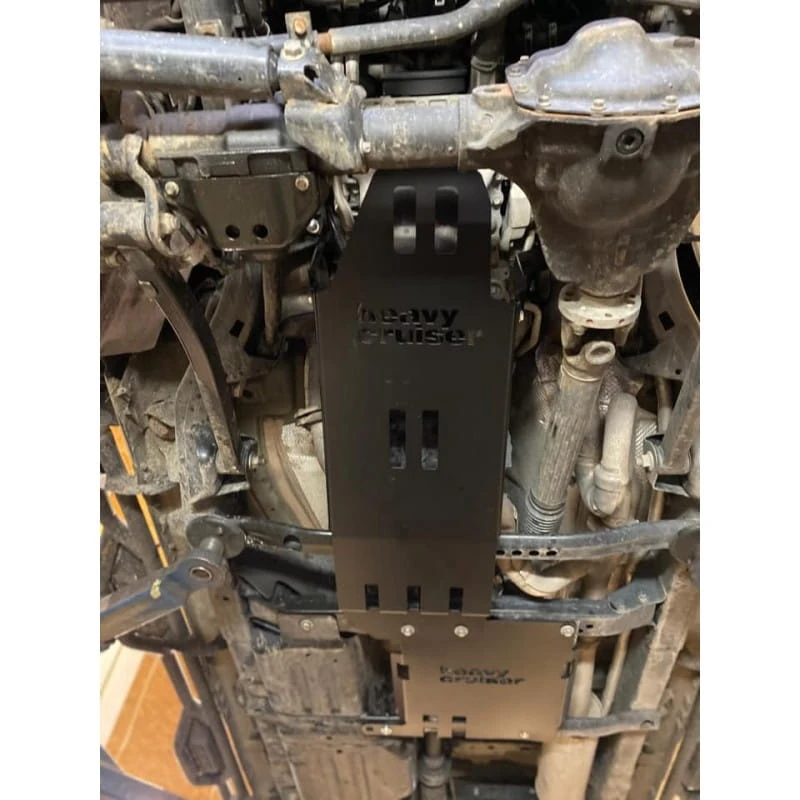 Osłona jest montowana bezpośrednio w fabryczne punkty ramy pojazdu, dzięki czemu instalacja nie wymaga żadnych przeróbek – ani wiercenia, ani spawania. Jej konstrukcja jest kompatybilna z osłoną silnika i skrzyni biegów Heavy Cruiser, co umożliwia stworzenie pełnego, spójnego systemu ochrony zespołu napędowego Gladiatora. Dwuwarstwowe malowanie proszkowe oraz podkład antykorozyjny klasy 5 zapewniają wysoką odporność na korozję, a precyzyjne wykonanie gwarantuje trwałość i pewność działania.