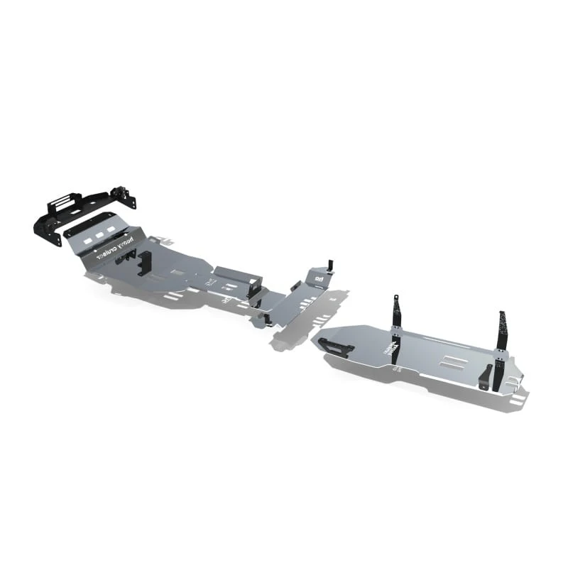 Zestaw obejmuje cztery pełne osłony podwozia oraz płytę montażową wyciągarki, tworząc kompleksowy system zabezpieczający newralgiczne elementy pojazdu przed uszkodzeniami w terenie.
