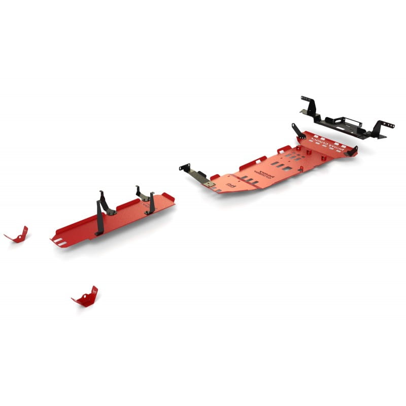 Zestaw zawiera pięć wzmocnionych osłon podwozia oraz dedykowaną płytę montażową wyciągarki, zapewniając kompleksową ochronę newralgicznych elementów pojazdu – od chłodnic i silnika po reduktor, zbiornik paliwa i tylne amortyzatory.