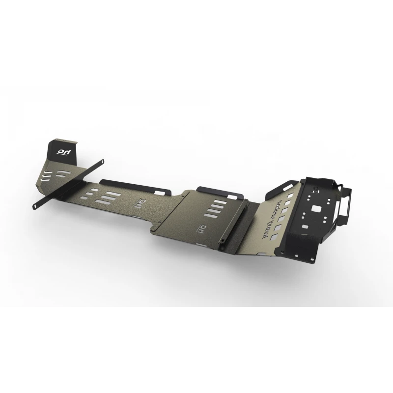 Osłony wykonano z wytrzymałej stali konstrukcyjnej, śrutowanej i malowanej proszkowo w technologii dwuwarstwowej, co zapewnia doskonałą odporność na korozję, błoto i uderzenia kamieni. Zestaw przykręcany jest w fabryczne otwory ramy pojazdu, bez konieczności wiercenia lub spawania. Konstrukcja przewiduje odpowiednie wycięcia wentylacyjne i odpływy błota, co zwiększa trwałość oraz bezpieczeństwo eksploatacji pojazdu w terenie.