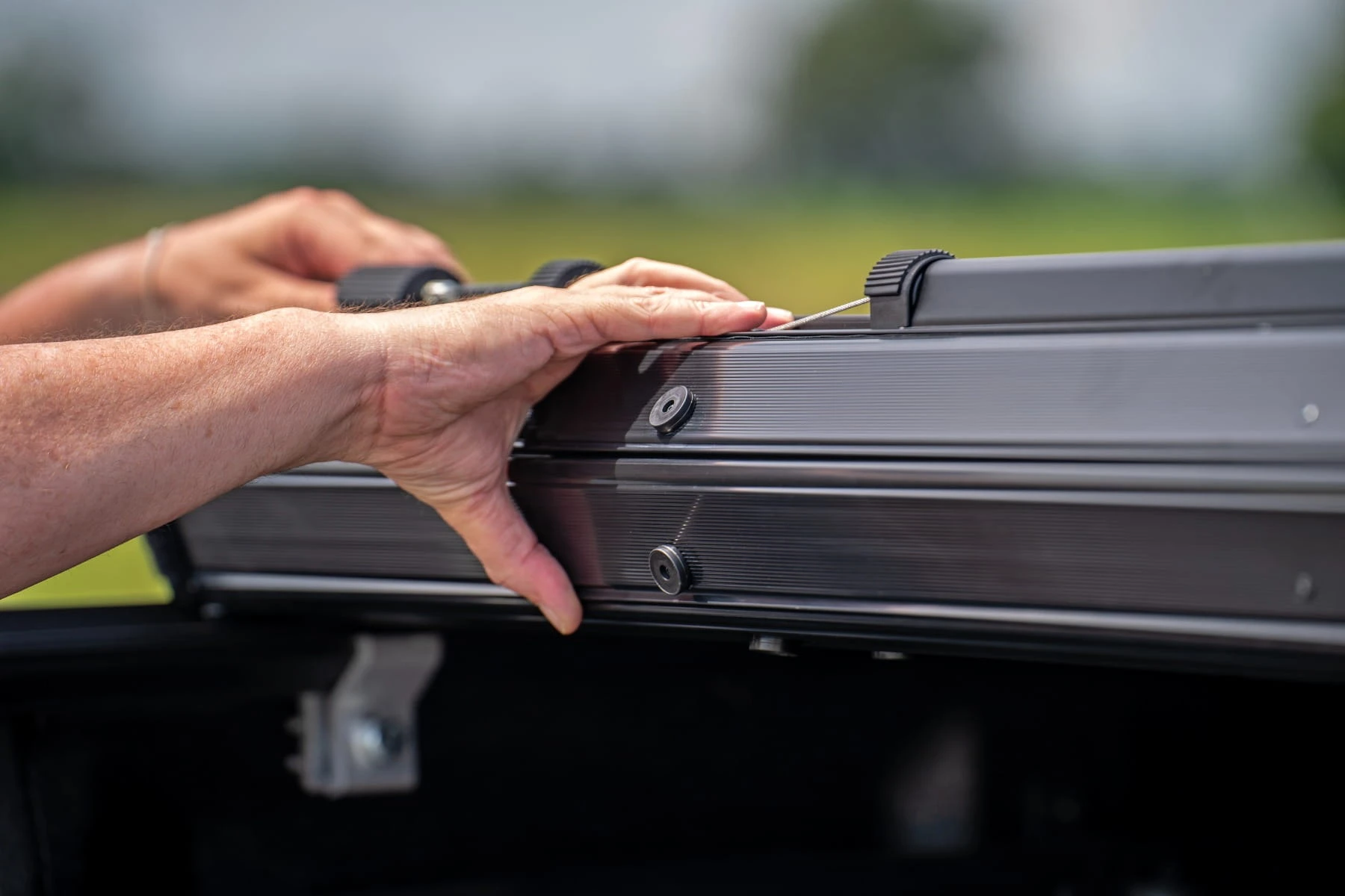 System rolowania umożliwia szybki dostęp do całej przestrzeni paki – wystarczy jedno pociągnięcie linki, aby zwolnić blokadę i w kilka sekund uzyskać pełne otwarcie. Mechanizm automatycznego zamykania zapewnia pewne i bezproblemowe ryglowanie.