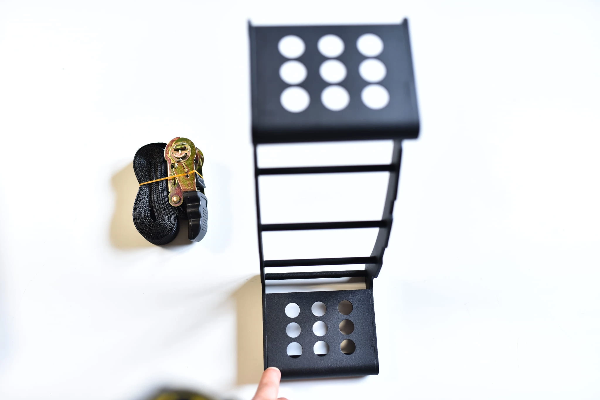 Instalacja jest niezwykle łatwa – wystarczy przepleść pas przez schodki i przypiąć je do koła zapasowego. Schodki można w każdej chwili szybko zdemontować lub przełożyć na inny pojazd.