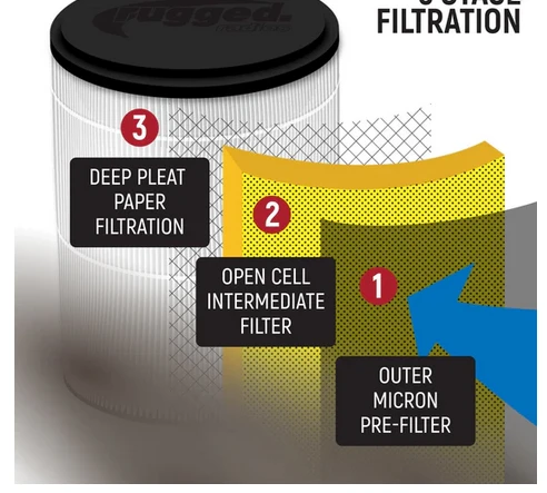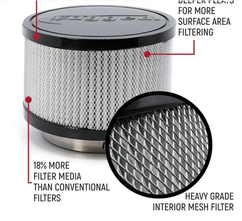 Zastosowanie aż 6,5 stopy materiału filtracyjnego (o około 18% więcej niż w standardowych filtrach) oraz głębszych plis znacząco zwiększa powierzchnię filtracyjną, co przekłada się na wyższą skuteczność i dłuższą żywotność. Wewnętrzna siatka stalowa zatrzymuje większe zanieczyszczenia, podczas gdy filtr piankowy oraz filtr wstępny typu micron tworzą dodatkowe warstwy ochronne.